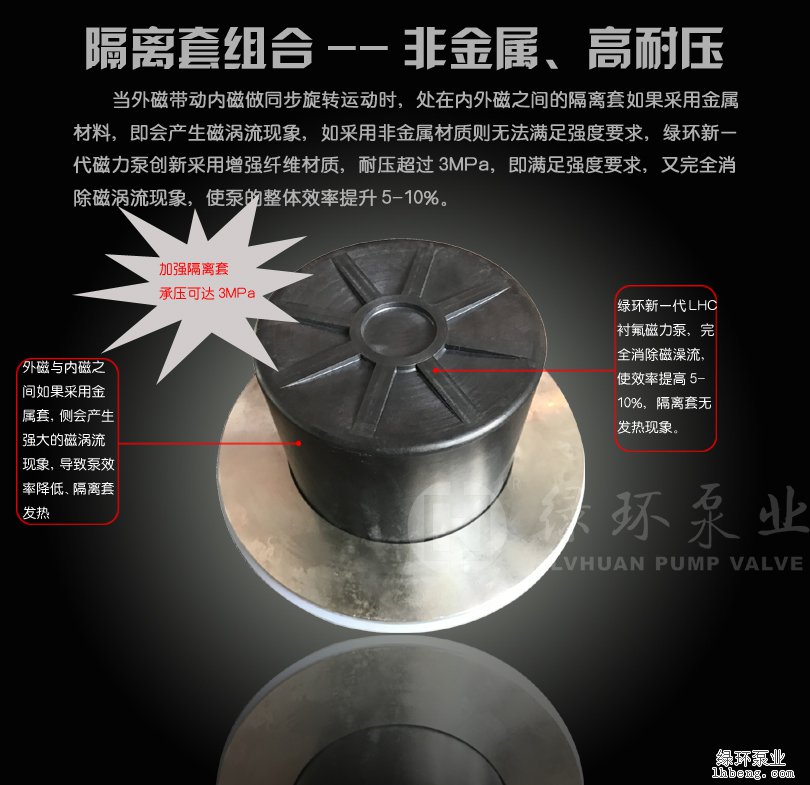 四、材料上:LHC磁力泵主轴、轴套采用间隙配合,且材质均采用自润滑抗干磨无压烧结碳化硅制成。泵的加强套采用碳纤维增强PEEK,无磁涡流现象,耐压3MPa。