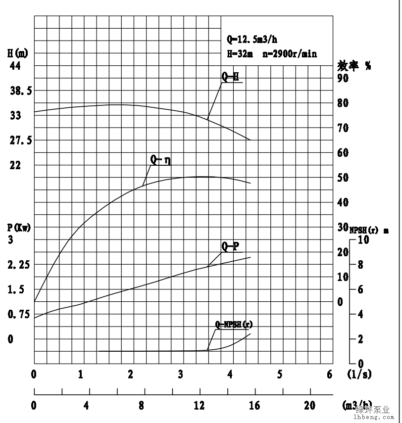 客户自选型号:LHF50-32-160,衬氟离心泵,该泵额定参数为:Q:12.5m3 H:32M  客户放大扬程12M。