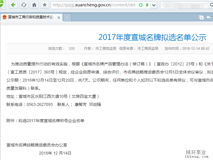 绿环市场部:12月14号,从市工商质监局传来的喜讯,绿环泵业有限公司绿环牌化工泵荣获《2017年度宣城***产品》。 市委市政府为推动质量提升行动的有效实施,根据《宣城市***产