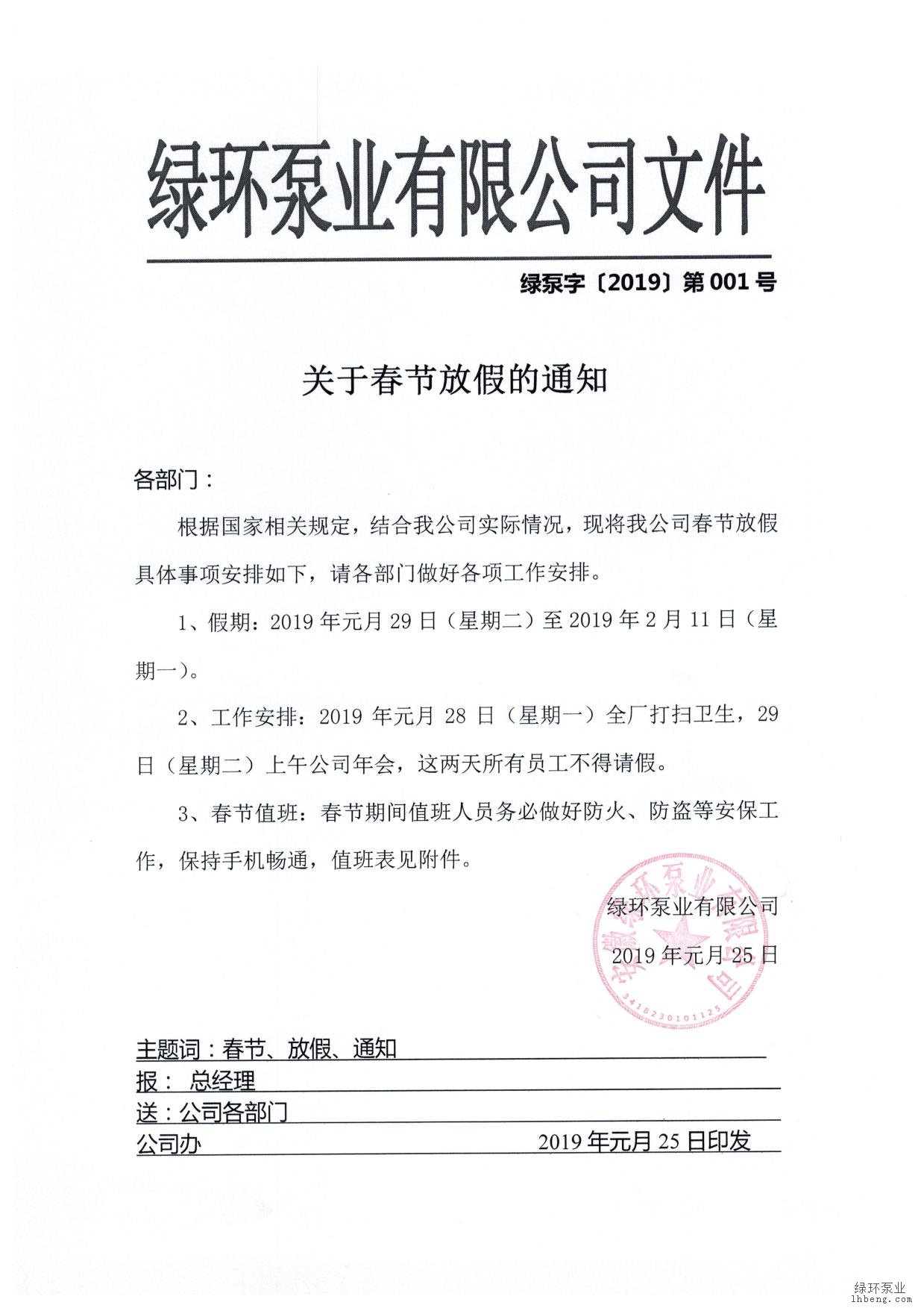 2019年绿环泵业春节放假通知安排