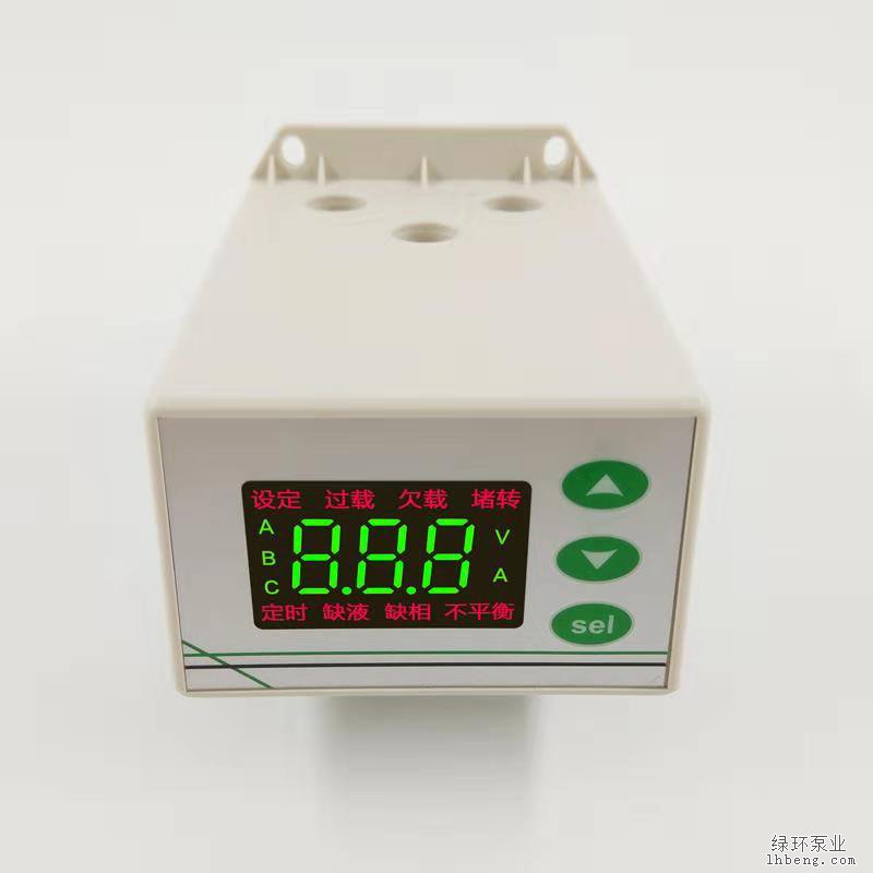 该保护器是绿环与供应商共同开发的智能型泵类专用保护器,是传统热继电器和泵保护器的升级换代产品。该产品采用数字处理技术,高亮度LED显示,通过内置的电流互感器检测电动机的三相负载电流,可以显示三相电流并根据电流判断是否存在过载、缺液、缺相、三相电流不平衡等故障。当电动机发生故障时,内部继电器触点断开,切断电动机电源。