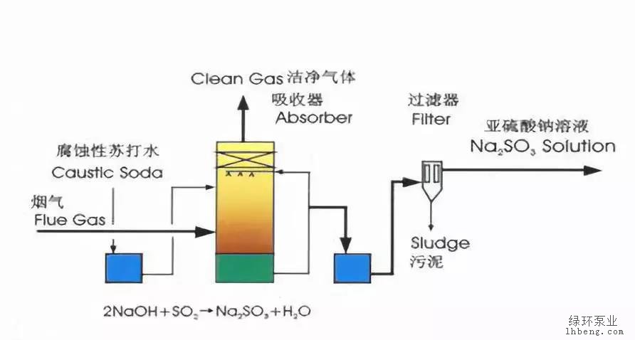 脱硫原理:该工艺以亚硫酸钠为吸收剂,在低温条件下吸收烟气中二氧化硫,生成亚硫酸氢钠。饱和溶液通过加热、分解重新产生 SO2可用于制硫酸或硫磺。由于水的蒸发而使亚硫酸钠结晶,亚硫酸钠结晶经溶解后再用作吸收剂循环使用,故也称之为“亚硫酸钠循环法”。